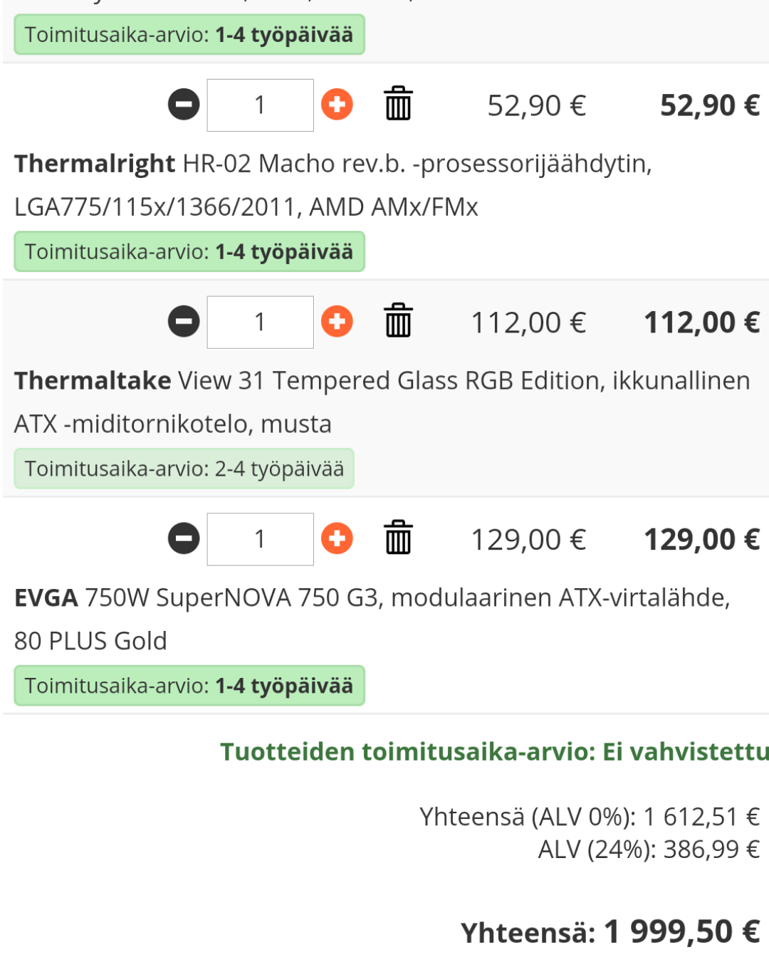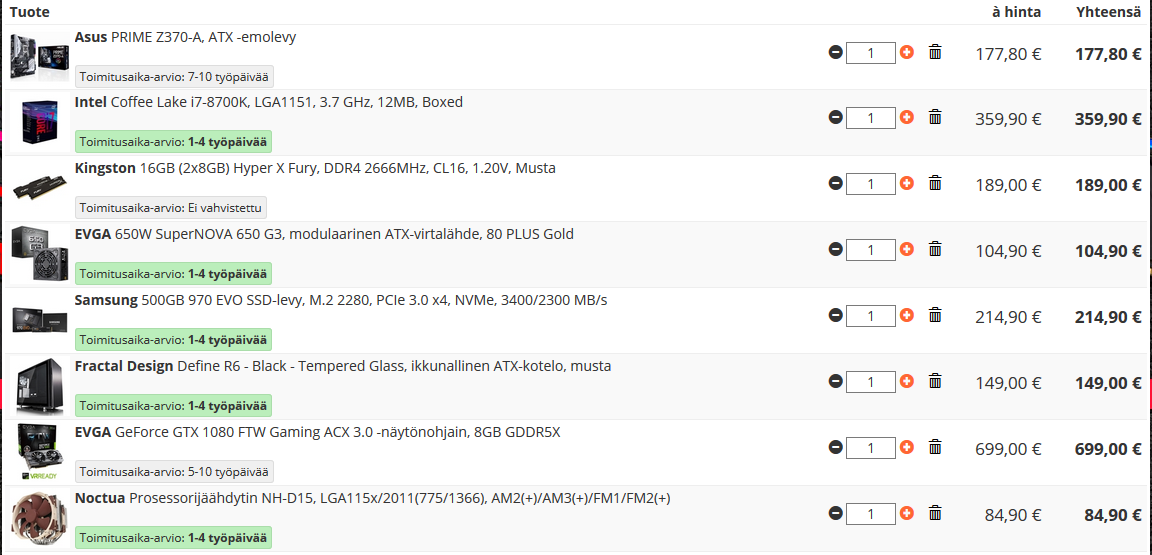 Olis tarkotus kasata nyt se eka oma pöytäkone. Läppäril menty tähän asti eikä tuo pelaaminen saati videoeditointi tahdo sujuu kovinkaan jouhevasti.